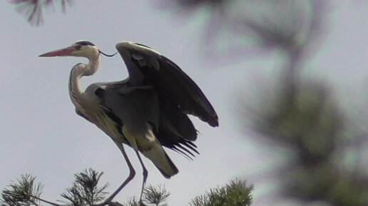 СЕРЫЕ ЦАПЛИ качаются на ветках сосны в ветреную погоду весной