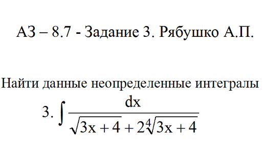Решение неопределенного интеграла ∫dx/(√(3x+4)+2∙4^√(3x+4)) из Рябушко А.П. АЗ – 8.7 - Задание 3.