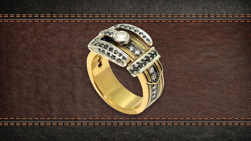 Видео изготовления на заказ мужского золотого кольца в виде пряжки на ремне с черными и белыми бриллиантами.