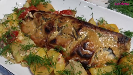 СКУМБРИЯ ЗАПЕЧЁННАЯ С КАРТОШЕЧКОЙ В ДУХОВКЕ .