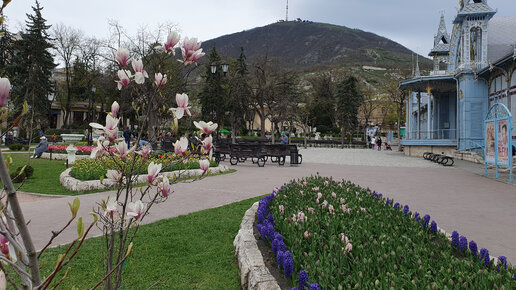 г. Пятигорск. Дыхание Весны. Изобилие красоты в парке Цветник. Парк Эммануэля и вершина г. Машук.