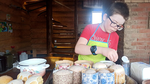 Пасхальные куличи запечённые в русской печи. Сделала новый рецепт помадки. Варлаам украшает куличи
