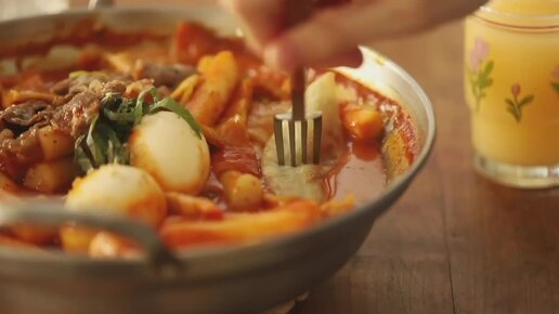 Токпокки с яйцом, и острым супом. Корейская уличная еда.