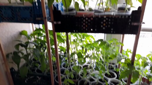 Рассада томатов на самодельной этажерке из пластиковых ящиков на подоконнике