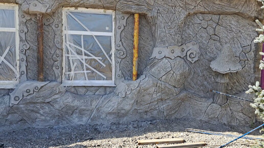оформление фасада дома декоративная штукатурка. вход в дом со слонами.