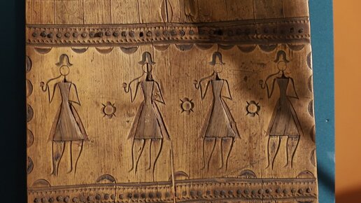 Быт русской деревни. Традиционное городецкое резное донце прялки со всадниками и солдатами, инкрустированное дубовыми элементами