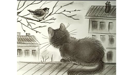 🐱🐤Кошка - охотница. Рисунок чёрным карандашом и опилками от карандаша.