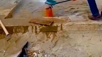 Прижали лопатой фонтан с водой, таким образом проливаем водой основное из песка.