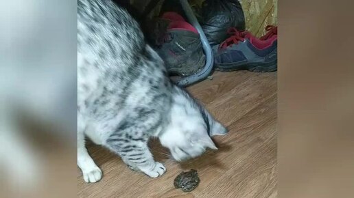 Кошка первый раз увидела лягушку