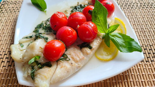Палтус запеченный c помидорами и базиликом в духовке. Простой и вкусный рецепт из палтуса за считанные минуты.
