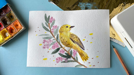 Птичка канарейка. Пишем акварелью и украшаем поталью