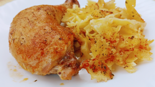 Сочная, с хрустящей корочкой курочка в объятьях не менее сочных и хрустящих макарон.