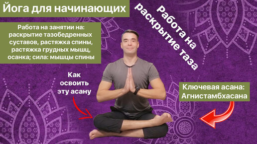 Йога для начального уровня. Растяжка спины и груди, осанка, раскрытие таза, агнистамбхасана (занятие №490)