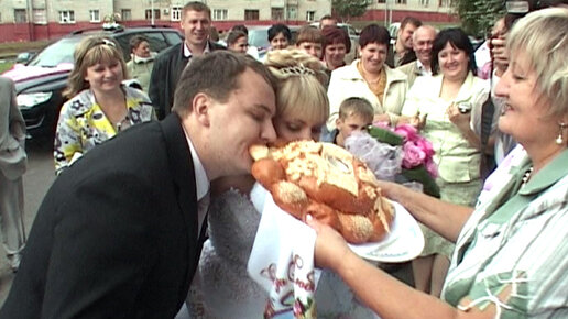 Свекровь встретила молодожёнов свадебным караваем