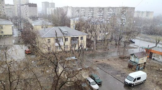 А за окном вновь снег идёт... Вид с окна на машины, дорогу, дома и улицу. 20.04.2023