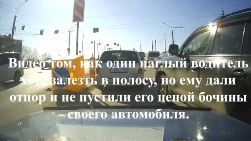 Видео том, как один наглый водитель хотел залезть в полосу, но ему дали отпор и не пустили его ценой бочины своего автомобиля.