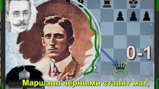 "План Маршалла" на победу - черными американец Фрэнк Маршалл играет русскую партию с матом, против Давида Яновского (Биариц, 1912, 0-1)