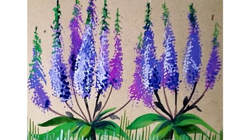 💜🍀💜Лиловые цветы, нарисованные гуашью при помощи зубной щетки на крафтовой бумаге.💜🌿💜