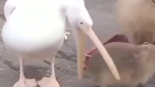 Пеликан пытается съесть капибару
