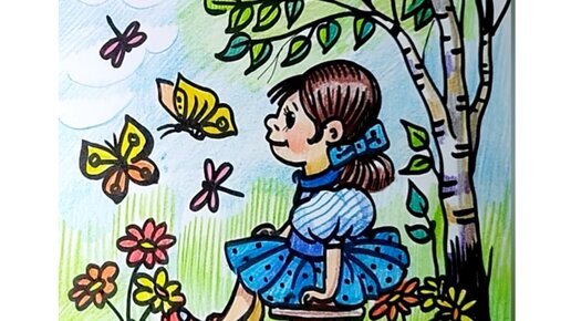 🌿✨🌼🌿На скамейке под берёзками. Иллюстрация, нарисованная черным маркером и цветными карандашами.🌿🌼✨🍀