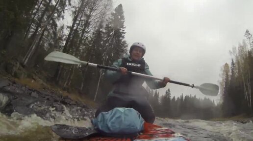 Прохождение порога около дороги на Янисйоки на сапе с каячным веслом, октябрь 2022