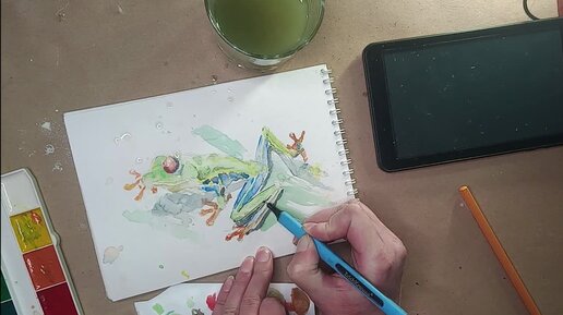 Как рисовать просто? Рисуем яркую лягушку детской акварелью.