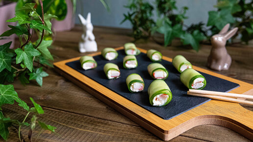 Роллы из огурца с крабовыми палочками. Легкая и свежая закуска за 5 минут.