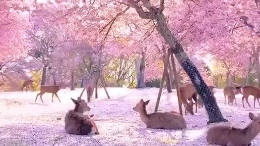 Пятизвездочный курорт. Олени отдыхают под цветущими вишневыми деревьями в японском парке Нара