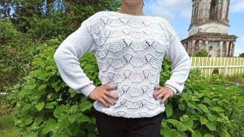 Женский ажурный джемпер спицами. Вяжем снизу вверх. Спущенное плечо. Размер 44-48.