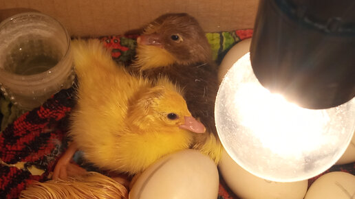 Мускусные утята выводятся в картонной коробке под лампочкой на 34 день инкубации🐣