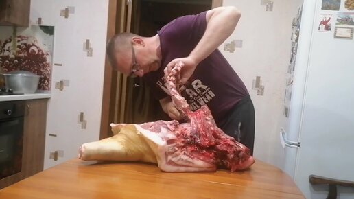 Зарезали поросёнка. Показываю, как муж разделывает лопатку.