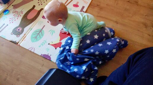 9-месячный малыш играет с комбинезоном