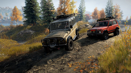 Уаз 469 и Нива 2121 отправляются на другой берег реки на охоту, рыбалку их поджидают различные препятствия ( SnowRunner )