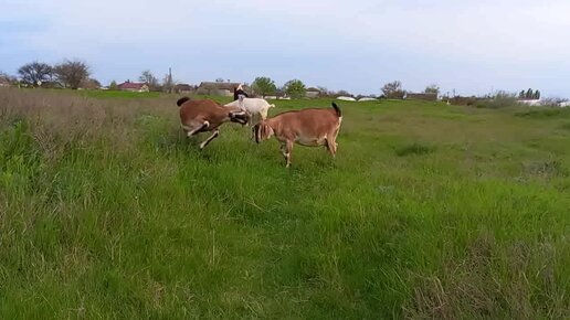 Обезроженная Нубийка учит бодаться молодняк.