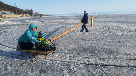 Весенний Байкал. Развлечения в Листвянке. Ручная карусель-сани.