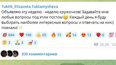 Елизавета Туктамышева в своем Телеграмм-канале ответила на вопросы. t.me/Tuktik_liza