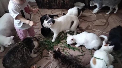 Внучка волонтера угощает котиков сочной зеленой травой