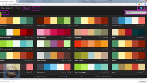 Создаем гармоничные сочетания цветов для работы в Photoshop. Сервис Adobe Color, кнопка «Смотреть»