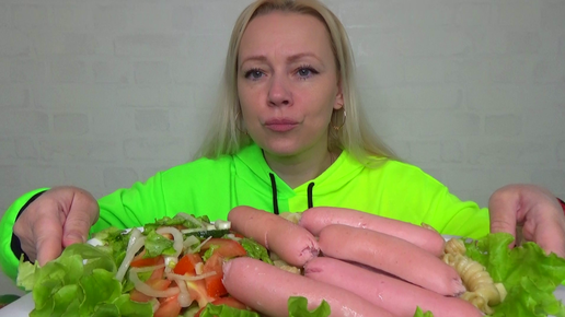 Макароны с сосисками, салат из свежих огурцов и томатов. Еда. Мукбанг!