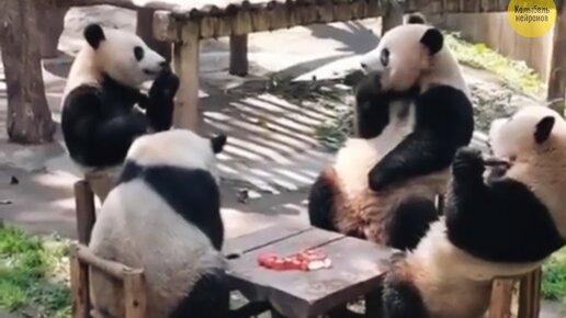 Панды сидят за столом, как бизнесмены – кадры дикой природы