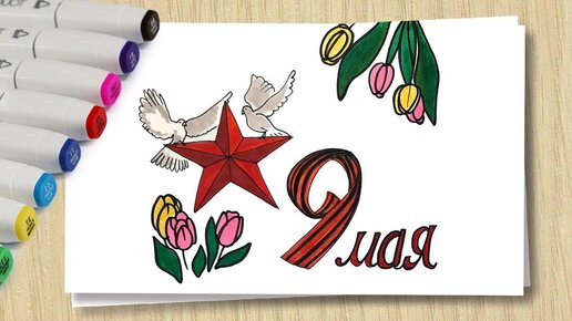 Рисунок к 9 мая / Рисуем Звезду и голубей / Открытка День Победы