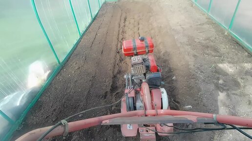 Обрабатываю землю в теплице мотоблоком.