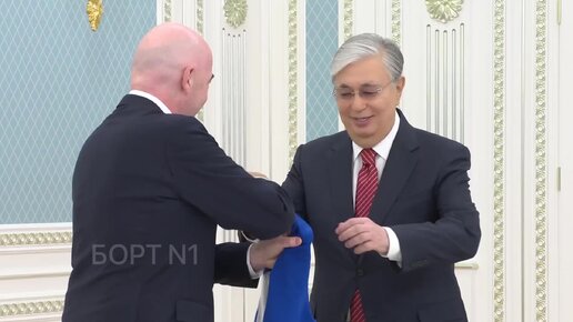 Джанни Инфантино вручил Токаеву официальный мяч ФИФА и именную футболку № 10, под которым играли Пеле, Марадона, Зидан и др.легенды футбола.