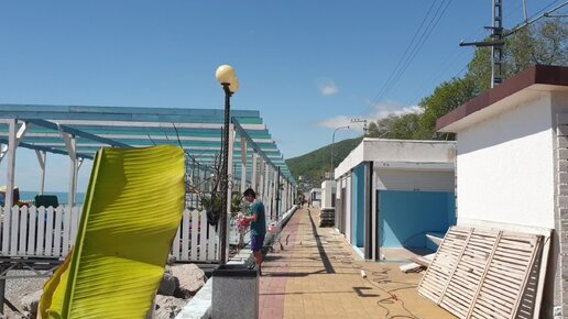 Майский загар. Пляж Дельфин. Стихает шторм. Идет подготовка к сезону. Лазаревское Сочи. Погода 3 мая 2023. Воздух +16 С, море +12 С