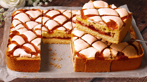 Песочный пирог с меренгой и прослойкой из джема. Нежный внутри, с хрустящей корочкой сверху!
