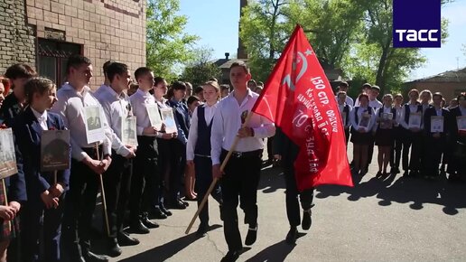 Учащиеся Луганского гуманитарно-экономического лицея-интерната во время акции памяти "Бессмертный полк" в преддверии празднования Дня Победы