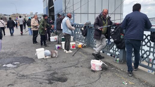 Рыбаки на Галатском мосту в Стамбуле и их улов