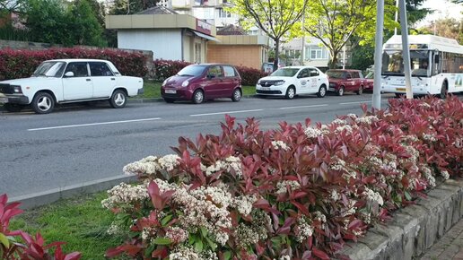 Украшение улицы. Цветет фотиния. Спирея Вангутта весной. Улица Партизанская в Лазаревском. Сочи. Погода 5 мая 2023. Воздух +18 С, море +12 С