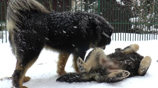 Катаются в снегу и закусывают березовыми дровами. Тибетские мастифы на свободном выгуле.