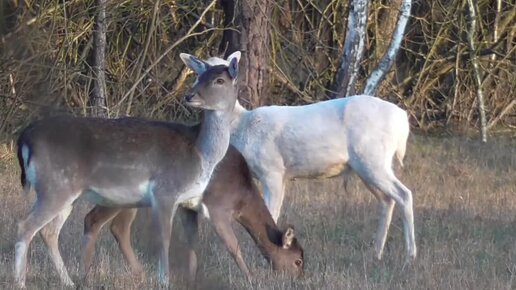 Лани на опушке леса. Белая лань
